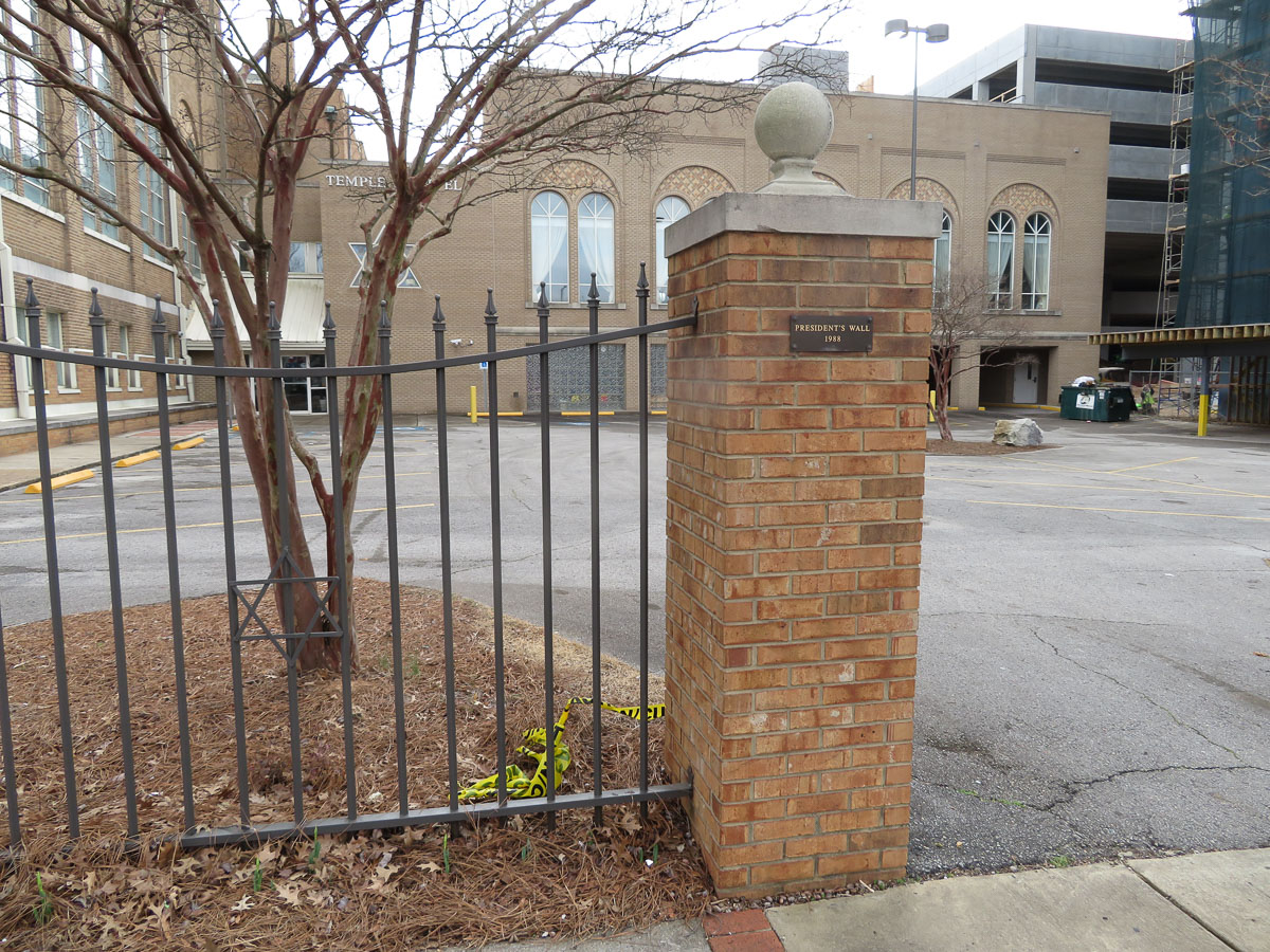 It is located in front of the parking lot of Temple Beth-el. The “wall” is actually a brick and iron fence installed as part of an effort to beautify the synagogue’s street front. There are no gates on the driveways that lead across into the parking lot and the synagogue’s main week-day entrance.