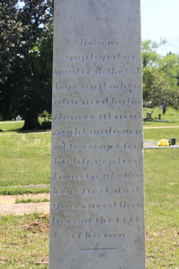 Unfortunately, however, I know more than one person in the Samford community who has been misled by the word “servant” in this inscription. They have come away thinking Harry was a free man. He was not. He was the enslaved servant of President Talbird, one of nine human beings Talbird owned. The memorial Baptists erected in his memory in Marion stated that “he illustrated the character of a christian servant faithful unto death.” As a friend said to me the other day, despite the fact that Harry defied the warning to flee from the fire, his own life was not his to give.