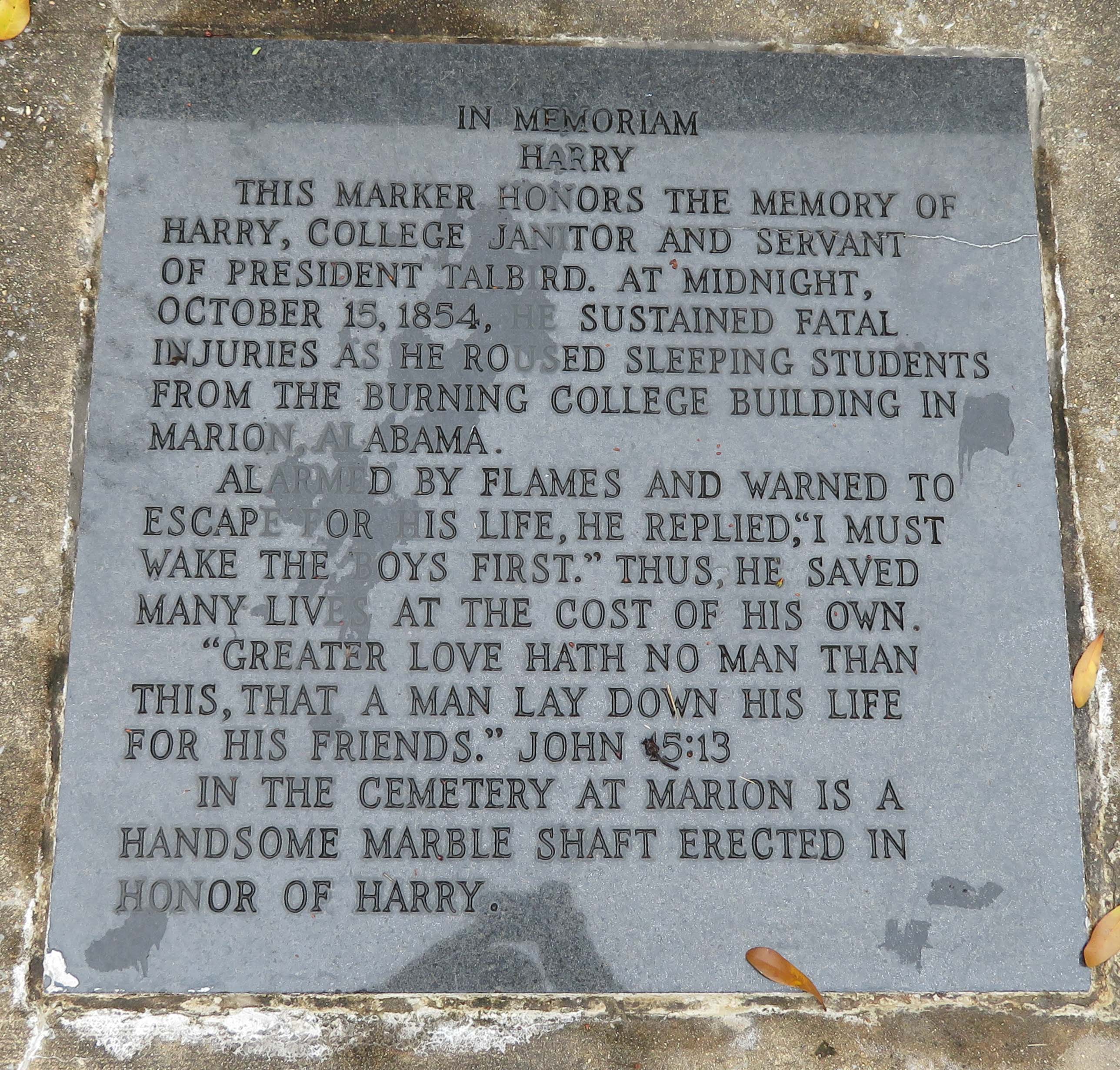 This marker honors the memory of Harry, college janitor and servant of President Talbird. At midnight, October 15, 1854, he sustained fatal injuries as he roused sleeping students form the burning college building in Marion, Alabama.