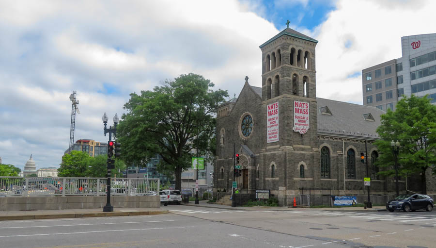 One of the oldest sites in Washington, D.C., designated for a church is located just a block north of Nationals Park. Since 1903, St. Vincent de Paul Roman Catholic Church, a Romanesque Revival building designed by architects W. F. Wagner & Brothers, has stood at the corner of South Capitol and M Streets SE. For the past six years it has held a special “Nats Mass” before Sunday games so that baseball fans can attend church before going to the game. Today’s mass will be at 6:30 p.m. With the World Series now tied at 2-2, I’m sure many of the faithful will be praying for the Nats to craft a win and not let the Astros sweep the three D.C. games of this World Series.