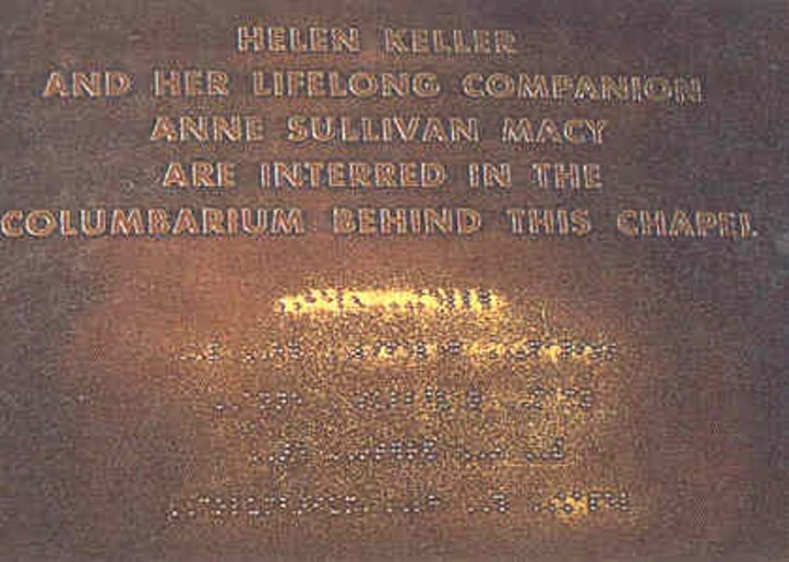 Keller, an author and activist, graduated from college and lived a productive and influential life despite being deaf and blind. Accordingly, the inscription on her memorial plaque appears in Braille as well as Roman type. It is shinny and worn from the touch of many hands.