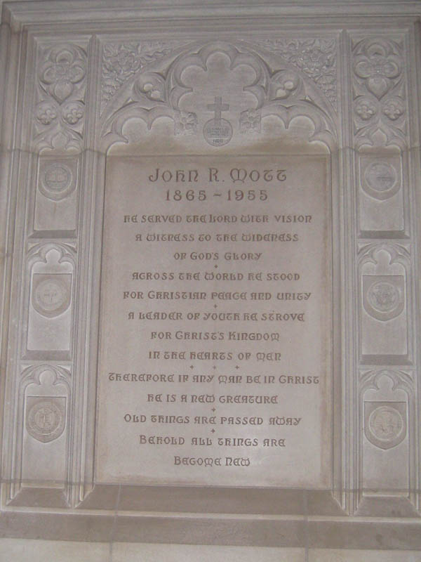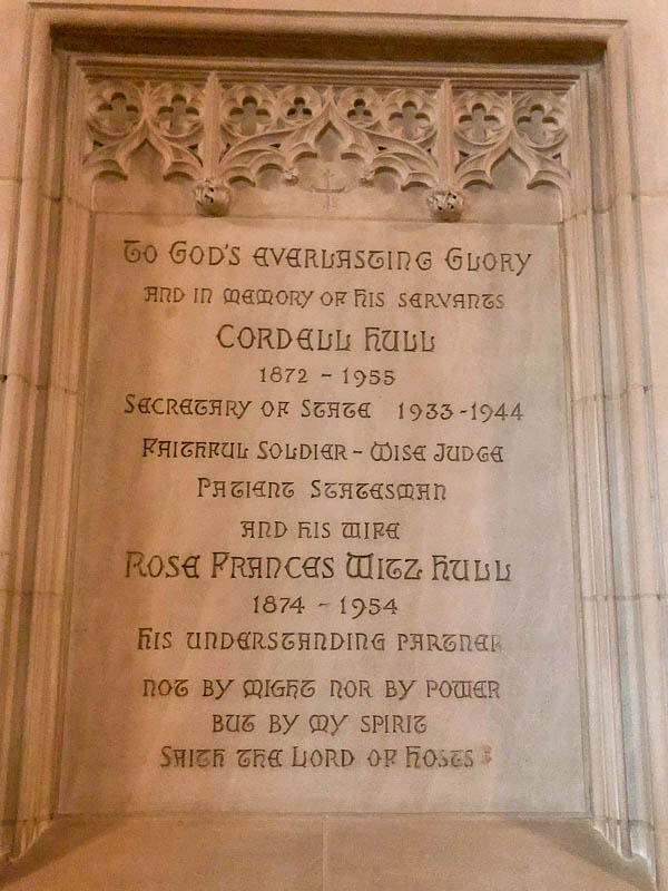 These burials brought fame to what was then more construction site than church. It was President Woodrow Wilson’s interment in 1924 that first drew large number of tourists through the cathedral’s gates. Cathedral leaders also sought to raise money to honor these heroes and construct portions of the cathedral’s structure as their memorial. This was achieved, for example, in the dedication of bays of the cathedral’s aisles in honor of Wilson and Secretary of State Frank Kellogg. Others interred in its crypt were honored with large memorial tablets such as those for Secretary of State Cordell Hull or ecumenist John R. Mott.