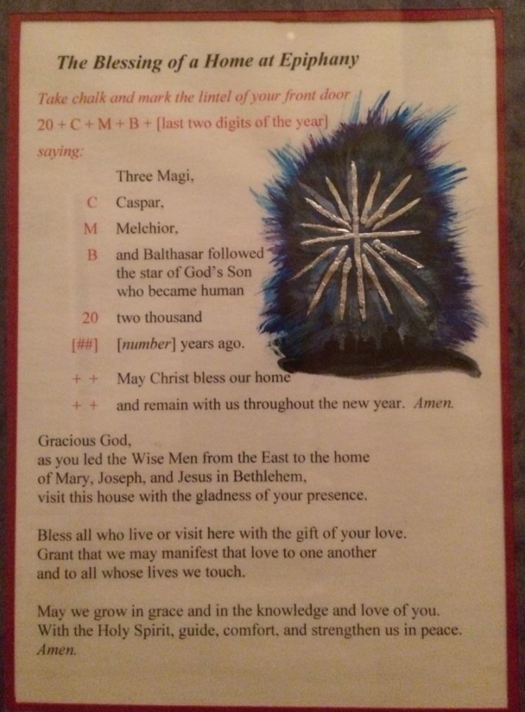 We’ve kept up the tradition every January 6. The text we use, like Marsh’s, is adapted from the Book of Occasional Services. (Our version was based on the 2003 edition we had in hand. The current 2018 edition is now available online and has a different rite on page 167.) Our changes are minor, but specific. For example, our front door faces due east. Therefore we mention that the magi also came from the East.