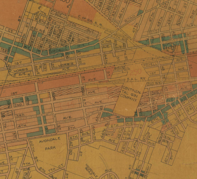 As the legend on the map indicates, dark red was for heavy industry, places like iron furnaces and rail yards. Dark yellow was for light industry, such as the Continental cotton gin plant in eastern Avondale. Blue was for commercial use. Light yellow and pink were for residences.