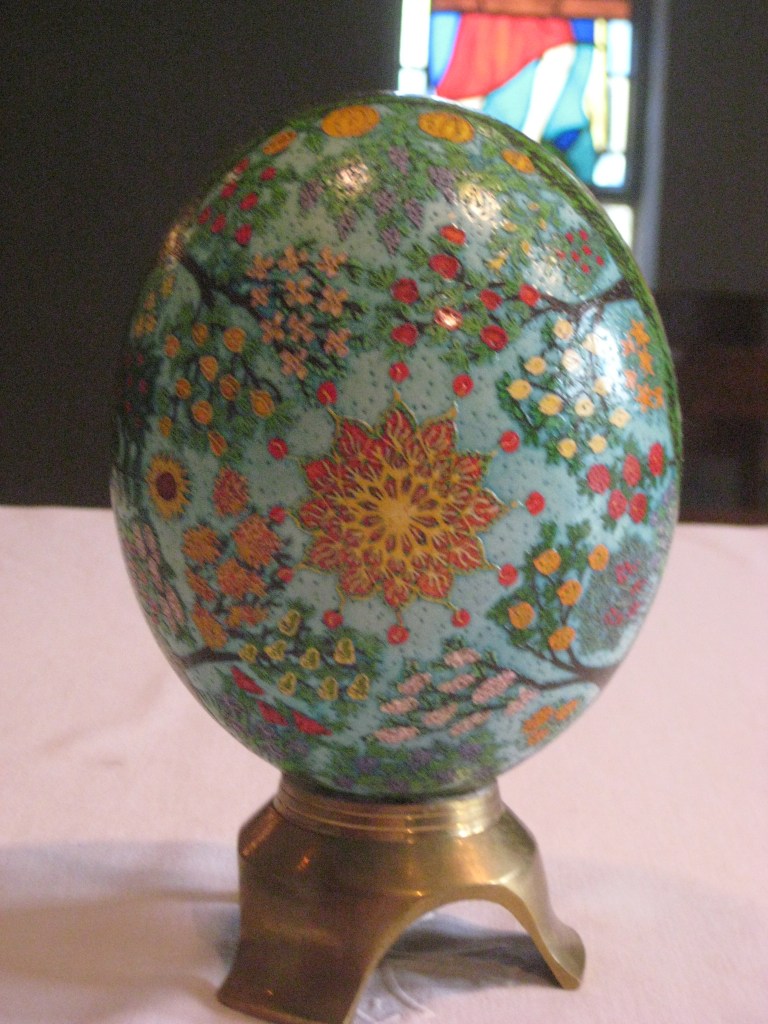 In part of the essay I discuss a special ostrich egg pysanky that my wife Martha made nine-and-a-half years ago. Pictures of it are below.