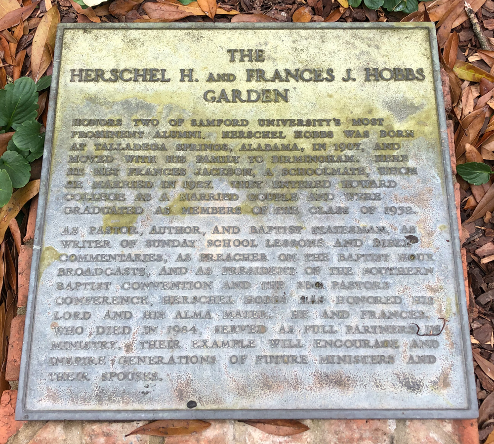 Last week I discovered that another memorial to Hobbs has been in the center of Samford’s campus for over thirty years. He, along with his wife Frances J. Hobbs, are remembered by one of the four raised flowerbeds (or “gardens”) in the middle of Samford’s Quad. The Hobbses attended Howard College, as Samford was then known, together. They rode public transportation from Ensley where he served as a pastor to the campus in East Lake. They graduated together in 1932. A bronze tablet records the dedication and the concrete border is carved with four passage of scripture which may have been chosen by Hobbs.
