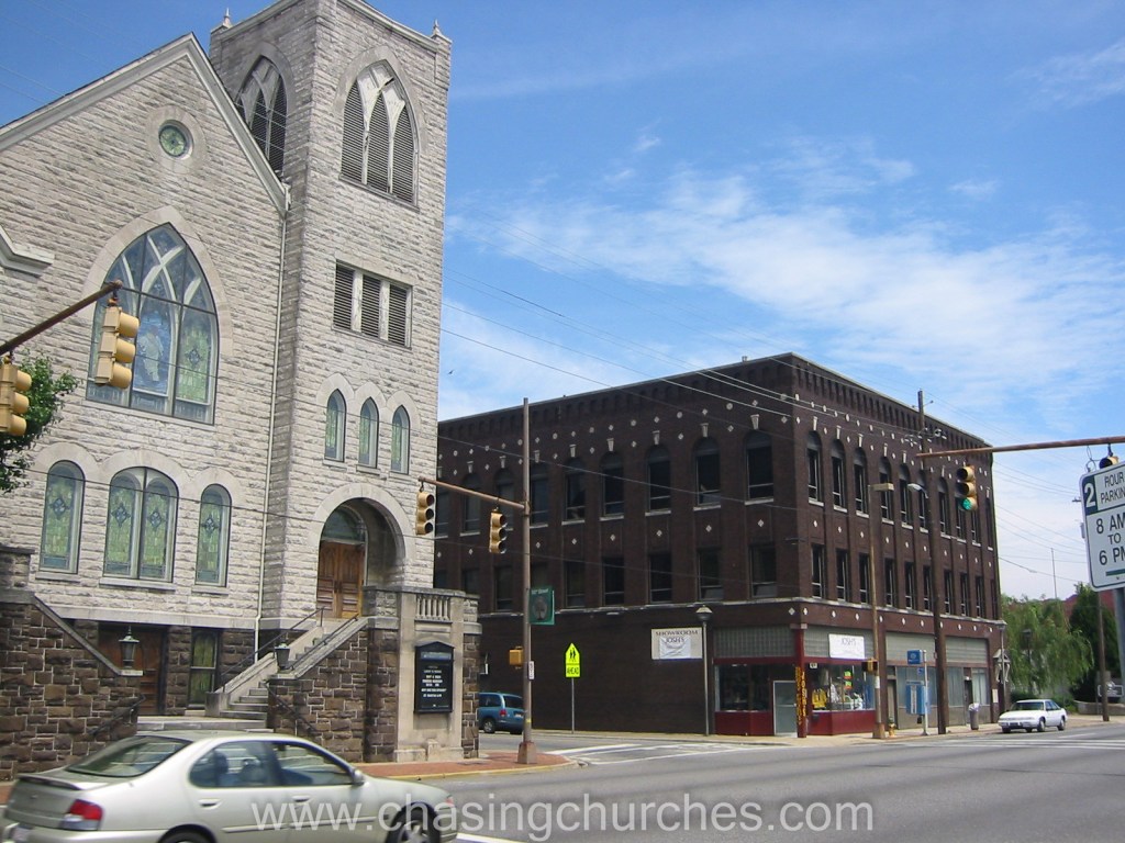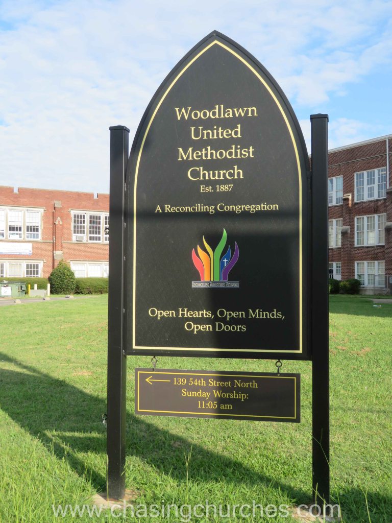 Woodlawn United Methodist Church had one of the highest cornerstones I have seen. I say “had” because the 1909 building was destroyed by fire on on Sunday afternoon May 31, 2009. Later buildings erected by the congregation were untouched and the congregation built a new building with a larger footprint on a side street where it still worships. A grassy lawn with a sign for the church occupies part of the old site and a parking lot for the neighboring bank the rest.