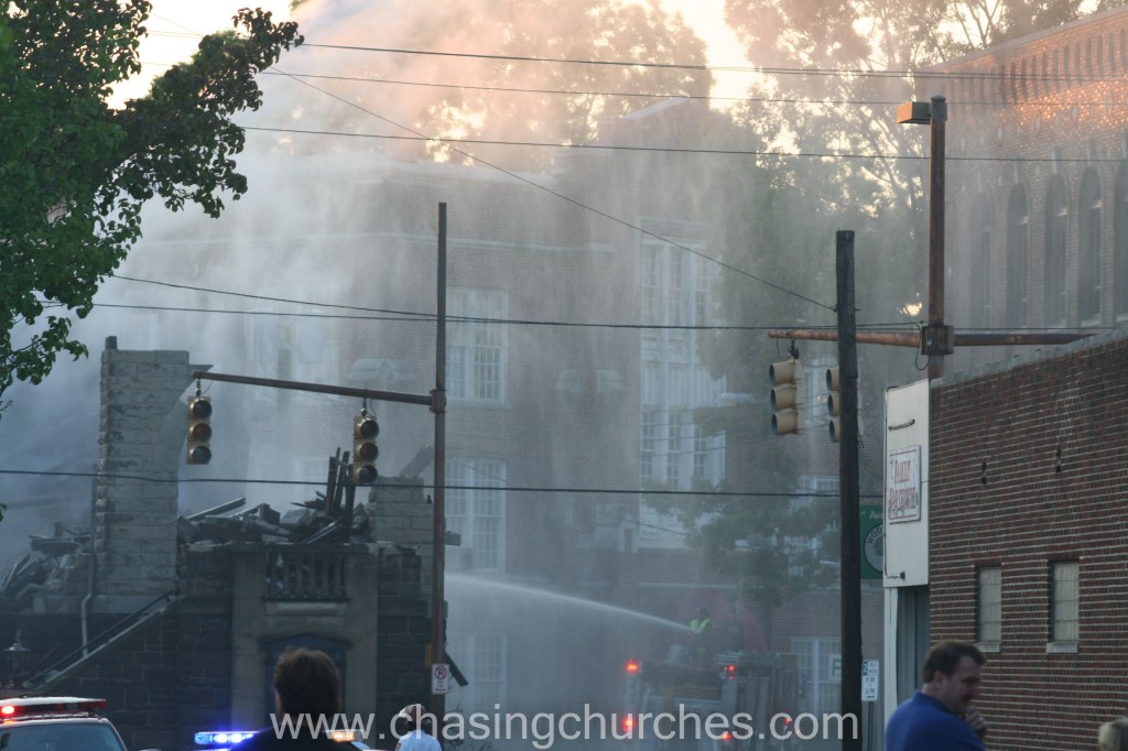 The cornerstone stood high on the wall in the lower section of the building, above the level of a modern pedestrian traffic signal. The cornerstone survived the fire and is embedded in the front of the church’s current building.