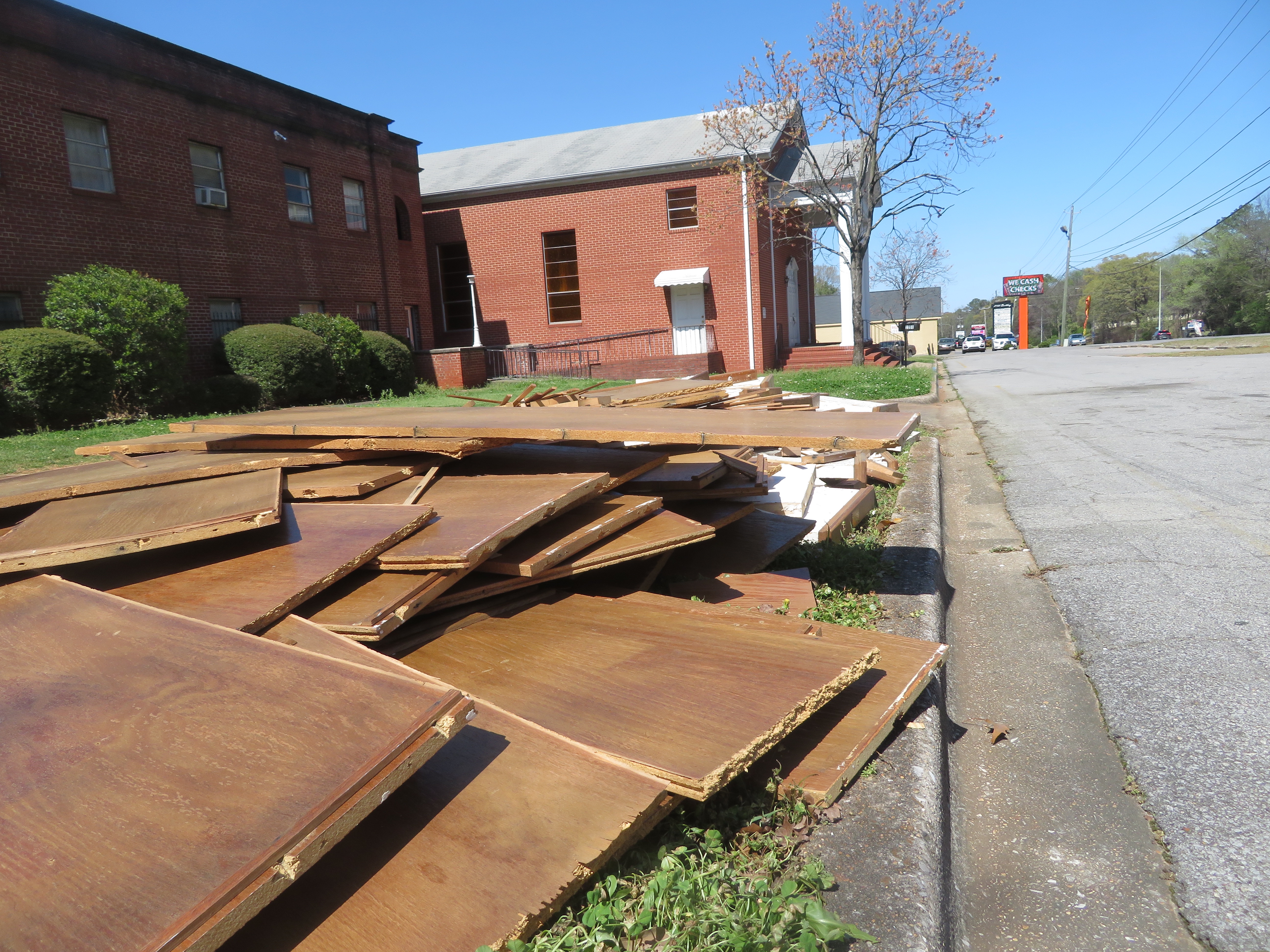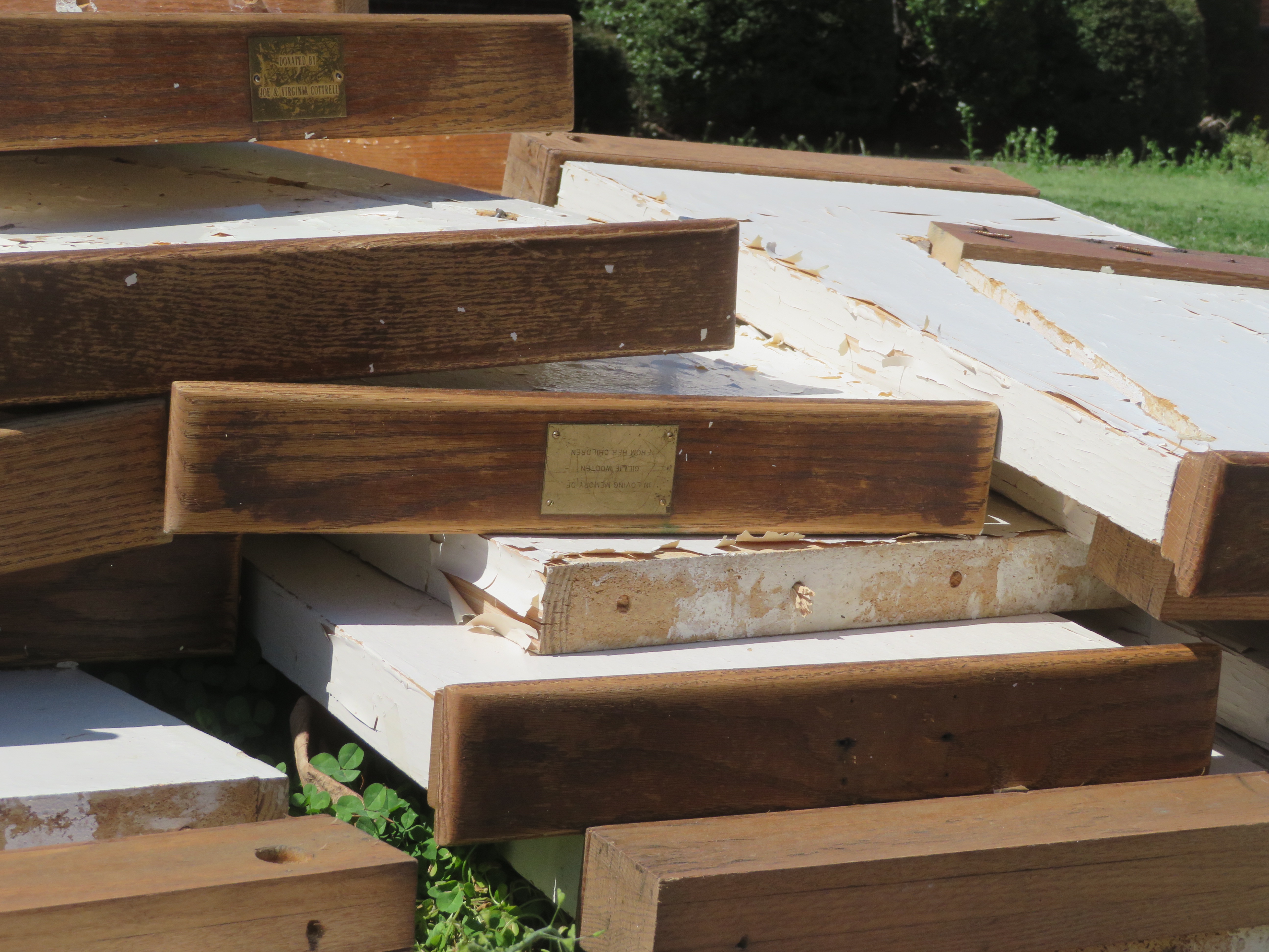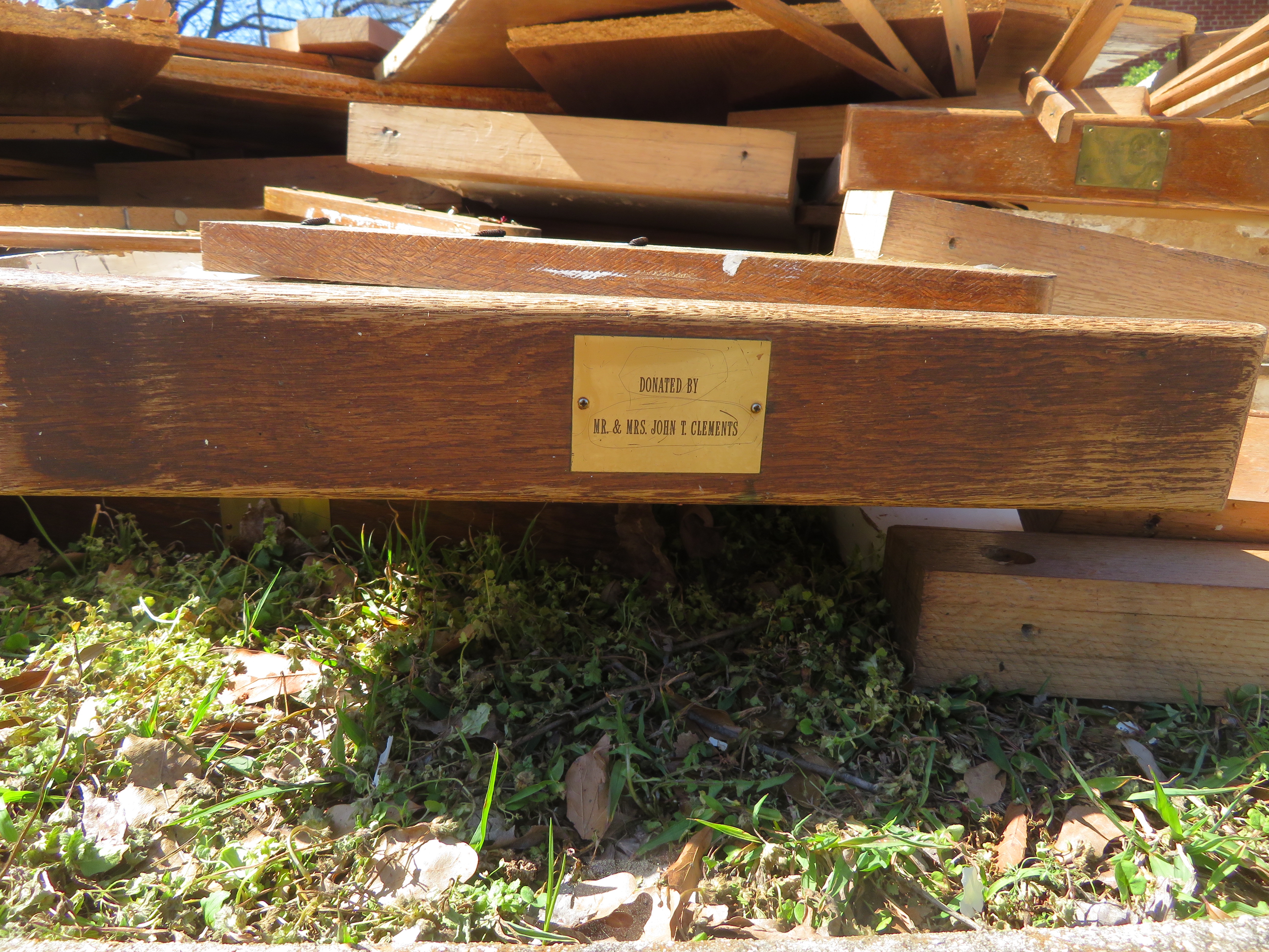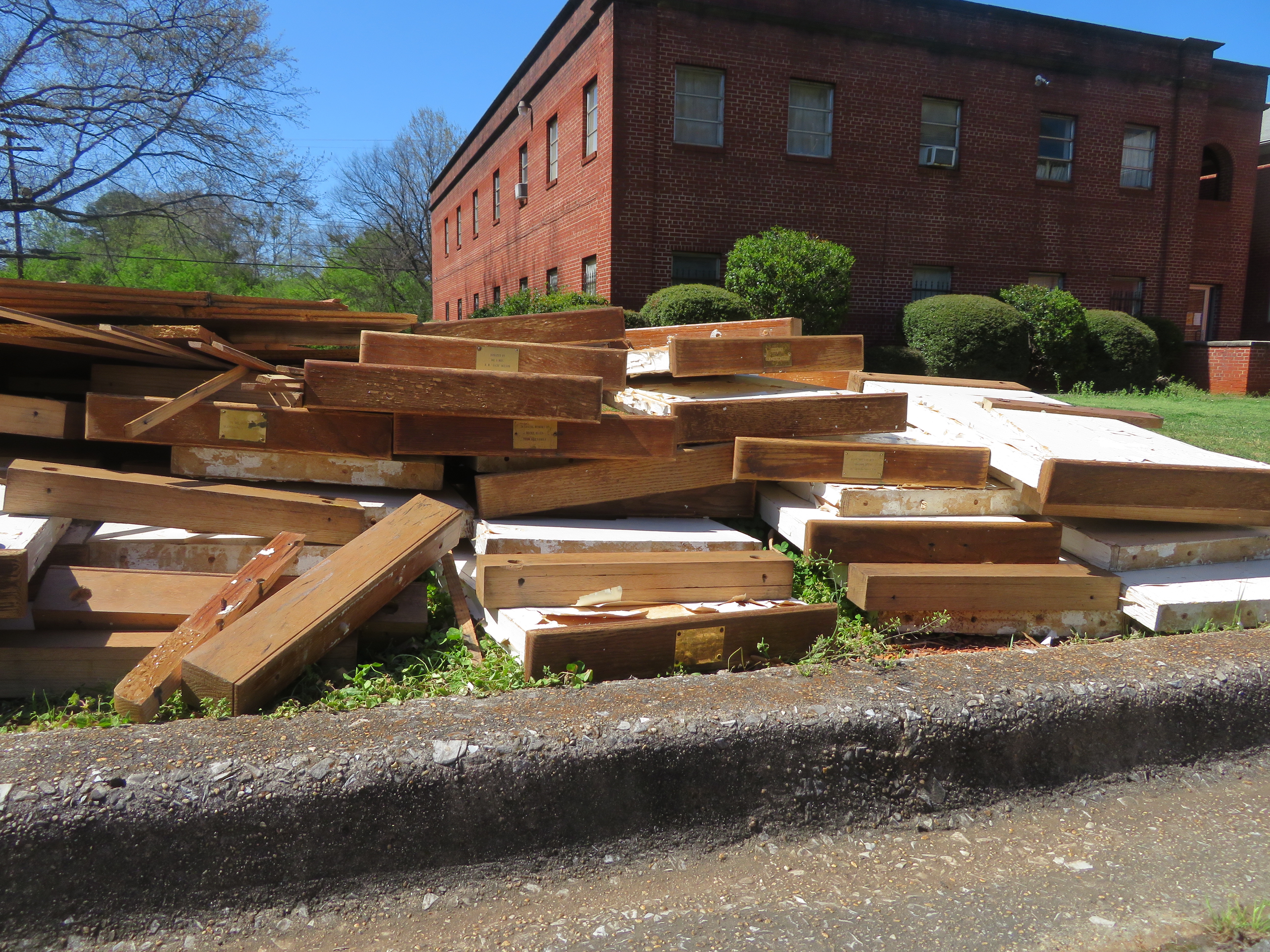 Like most post-war Colonial Revival churches, Green Springs had wooden pews with white ends with flat tops. These pews did their work for decades but a year or so ago they were out on the curb. No doubt more flexible seating was needed for the work of the Ministry Center. Still it was rather poignant to see the pews with their memorial plaques passing on.