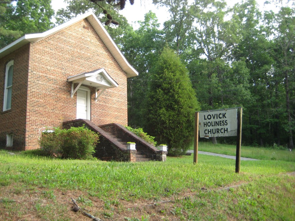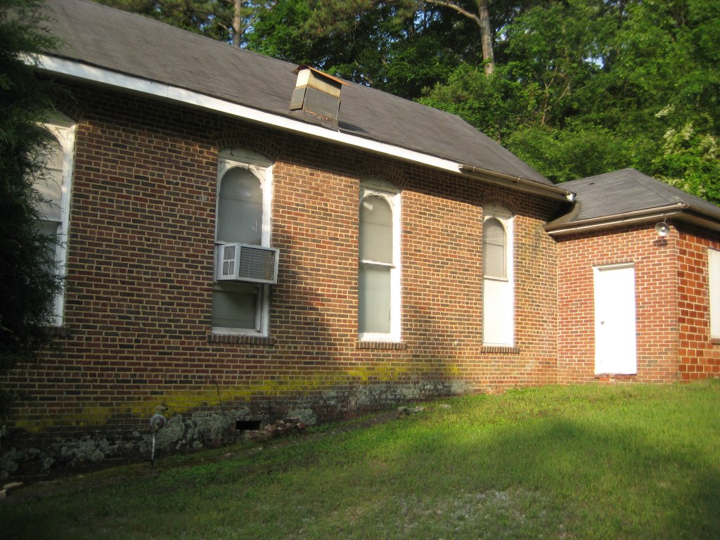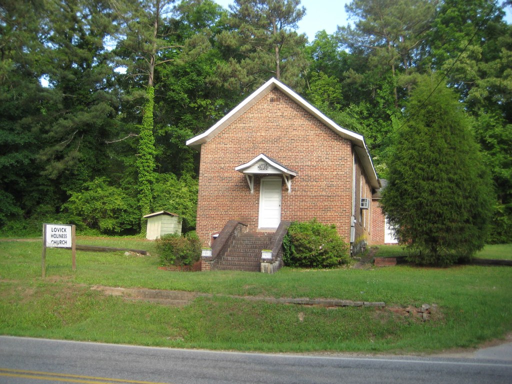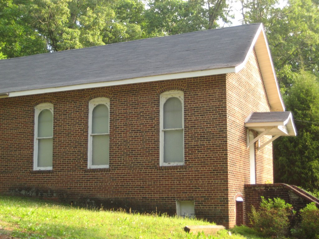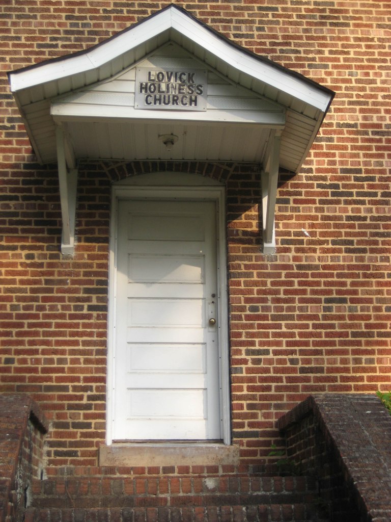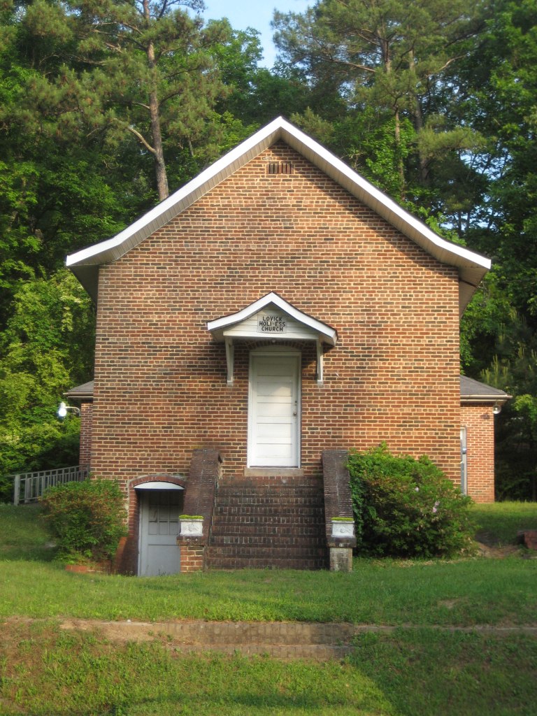 Lovick Holiness church is perhaps my favorite rural church in the Birmingham area. It is a simple brick rectangular building narrow entrance consisting of a single door. Somehow a narrow door seems appropriate for a Holiness church (Matthew 7:13-14). But it also has a lovely flared roof, arched brickwork over the windows and arched wooden frames in the top sashes of the windows. The bricks are laid in American bond and look machine made. All this suggests to me that the church dates to no later than the 1930s. 1910s or 20s seems likely.