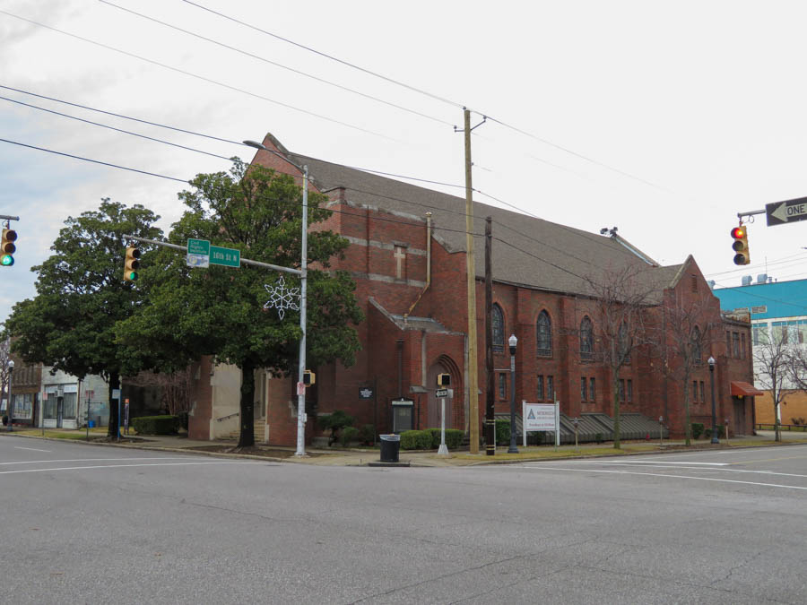 Organized in 1885, Metropolitan AME Zion Church at Fourth Avenue North and Sixteenth Street is among the oldest African American churches in Birmingham. Lovely Magnolias block part of the view of the 1955 brick Gothic-revival church that currently serves the congregation.