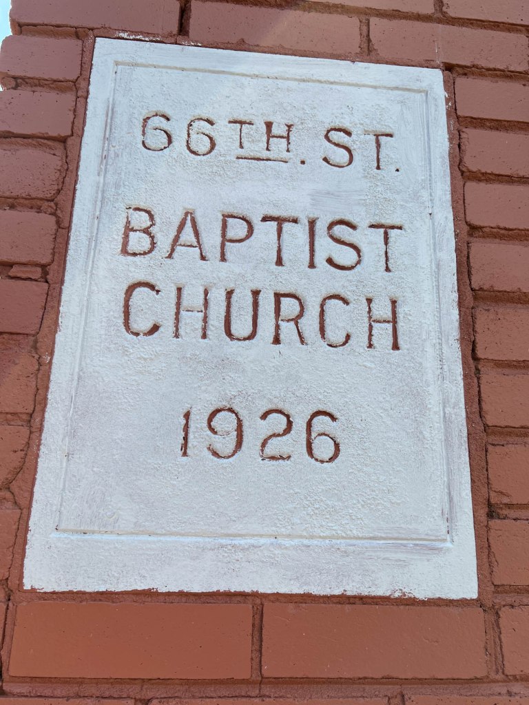 When you drive along 1st Avenue North, former 66th Street Baptist Church grabs your attention. It sits a block off 1st North on the corner of 66th Street and Division Avenue. Its current owner, Iglesia de Jesucristo Palabra Miel, has painted the front of the church several colors to make its brick Romanesque front pop out. I’m sure it was once surrounded by houses but now, its buildings are the only ones on the block.