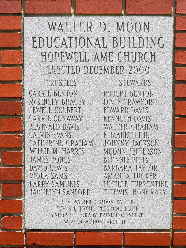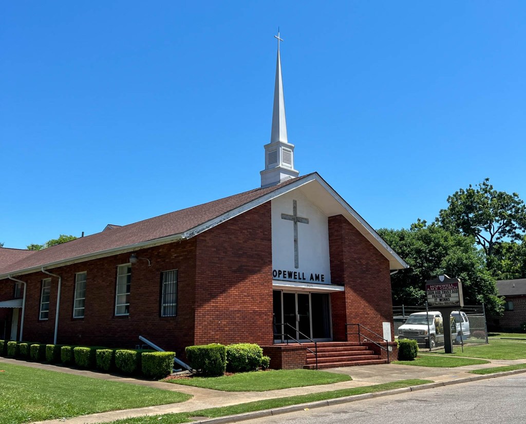 Hopewell African Methodist Episcopal Church is in Birmingham’s Kingston community at 925 44th Street North just off Richard Arrington Boulevard N. It is a handsome 1955 building with a 2000 education building.