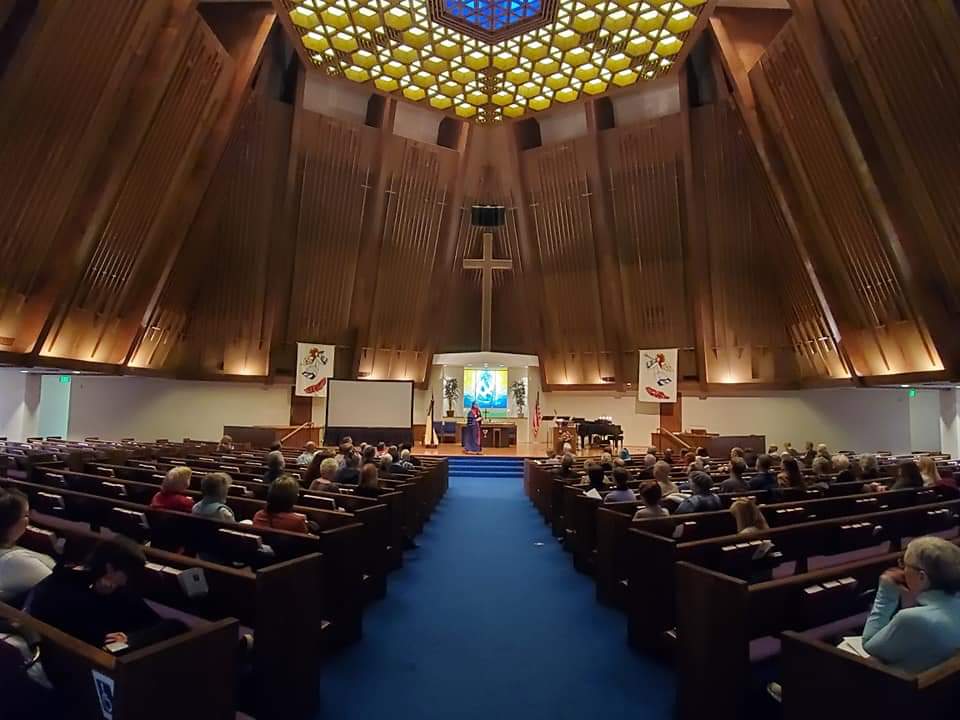 Central Christian began worshiping in a chapel on its present site in 1971. Its current hexagonal sanctuary takes advantage of modern construction methods to create a very tall welcoming space. Donald Helseth, the pastor at the time described it as achieving the ideal space for Disciples worship bringing “the minster and congregation together with the communion table at the center” (Harris 2013, 56-57). While the exterior evokes the architectural brutalism popular at the time, the interior is richly lined with oak.