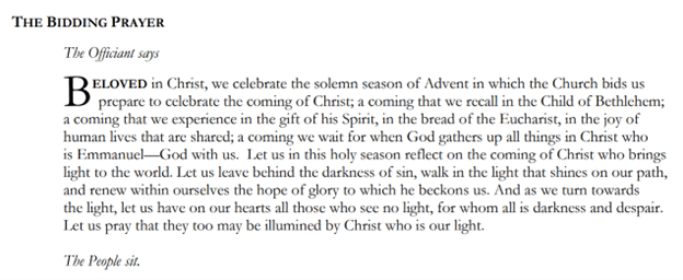 The Book of Occasional Services 2018 of the Episcopal Church and many other sources provide bidding prayers for a service of Advent lessons and carols that are modeled on the famous bidding prayer used at the Festival of Nine Lessons and Carols at Kings College, Cambridge, each Christmas Eve. The King’s prayer is superb, but Advent is different than Christmas and a wholly different prayer seems advisable.