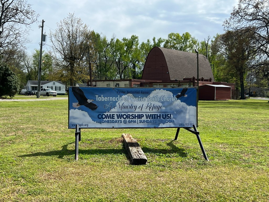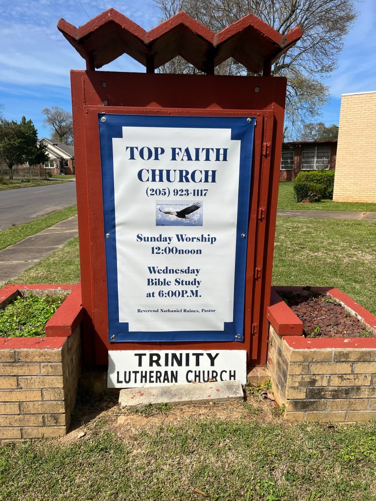 Property records show that the Lutheran church still owns title to the land, but Tabernacle of Praise Church (or T.O.P. Church) appears to be the main congregation using the building. I love the top of the church sign by the street echoes the roof over its porch.