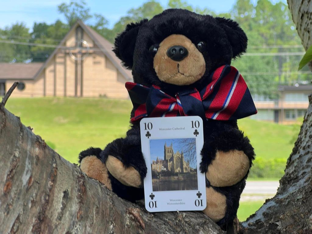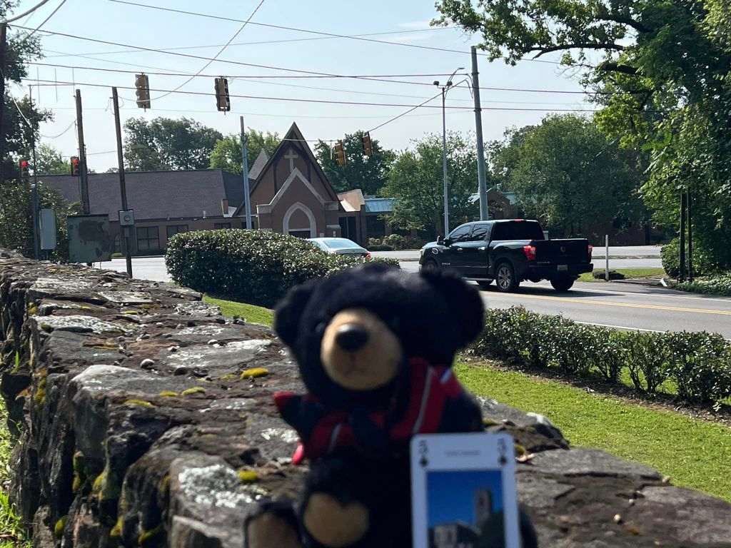I enjoy pedaling my bicycle and I study and teach about religion in American and religious space. I often combine the two as you can see from many posts on this blog. Last summer, for my 52nd birthday, I decided to see if I could pedal my bicycle to photographs buildings erected or occupied by 52 different religious denominations. To help keep count I used a deck of playing cards and included a card in each photo. (The cards also have pictures of churches on them.) My photo prop, Fred the Bear, held the photo in each photo.