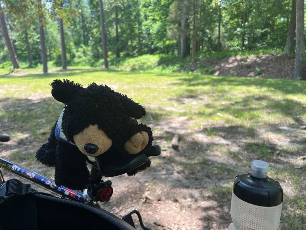 But I’m tired, so after rolling through a couple forts I stop alongside a line of tree-crested fortifications for more water and trail mix. Winter the Bear, my photo prop, sassy self-projection and conversation partner crawls out of my bag to demonstrate her boredom with Civil War earthworks.