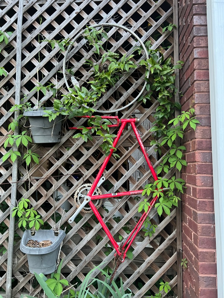 I hear this kind of thing a few time a year whenever an “old guy” who likes bikes sees my bike. I appreciate the appreciation, but I don’t get it. I’ve owned only 2 road bikes in the past 35 years. The first was steel-frame “12-speed” Schwinn World Sport that I rode for 30 years until a very pastoral mechanic at Redemptive Cycles in Birmingham convinced me it was time to “put it out on the back forty” because I had ridden it to death. The second is this LeMond that another guy at Redemptive said was the bike for me when I went in to get something a few weeks later. (I hung up the frame and wheels of the old bike facing our driveway, see below).