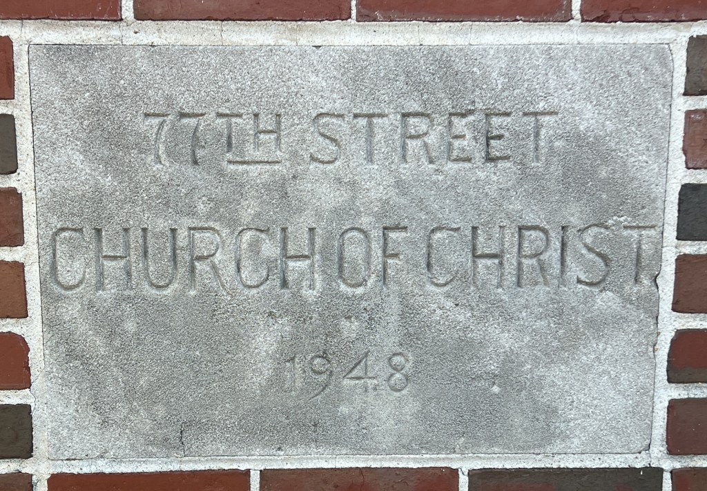 Indeed it was erected in 1948 by 77th Street Church of Christ. (Oporto-Madrid was 77th Street at that time). I would call the building Georgian colonial revival (or just colonial revival), but if it doesn’t quite qualify as such, it is definitely what Jay Price has designed “Mid-Century Traditional” not Mid-Century Modern. It is now the home of Agape Missionary Baptist Church, a congegation foundedin 2001. It is only two blocks from the old Howard College campus so if student there were included to visit a Church of Christ, this is where they could have gone.