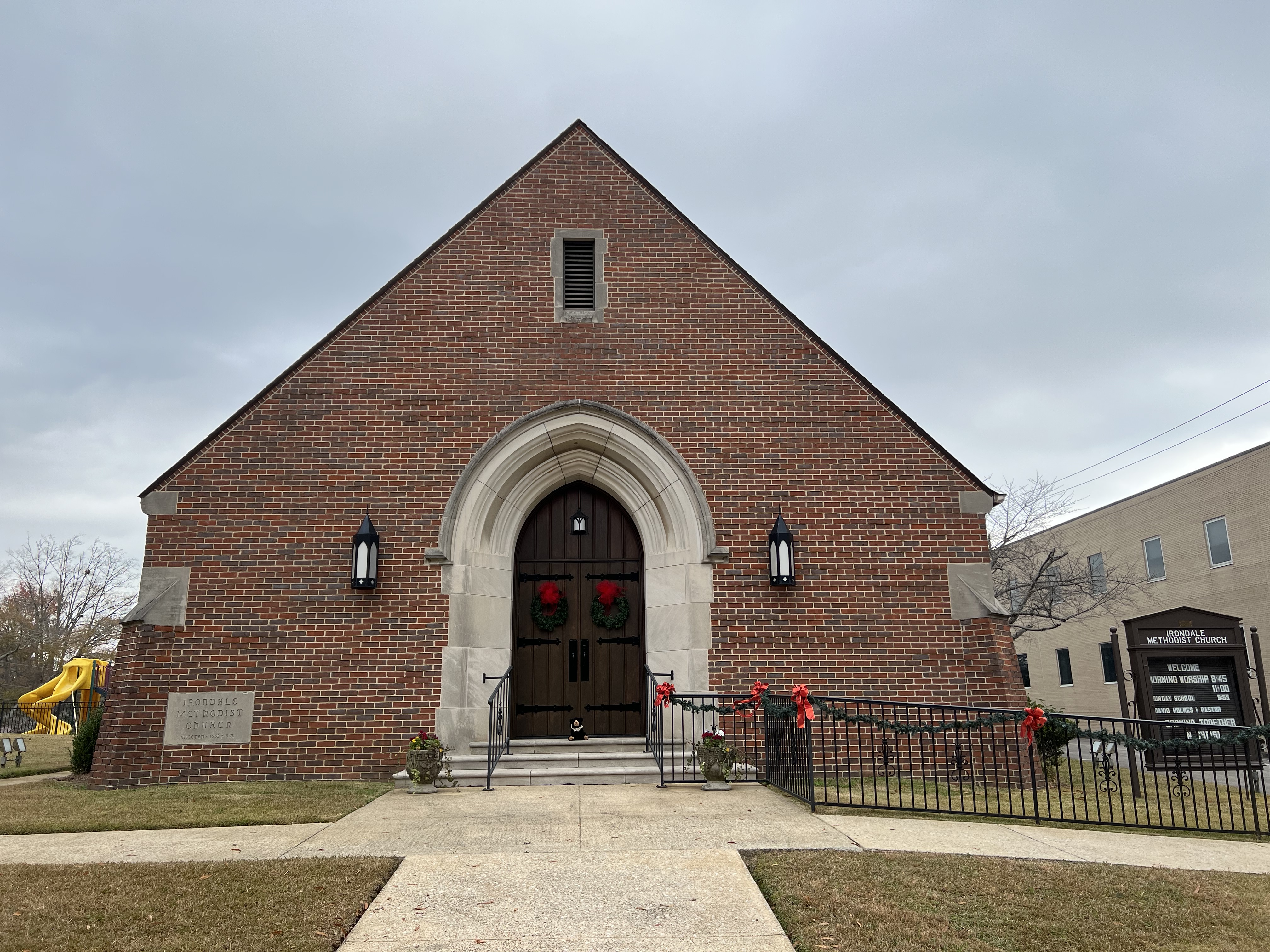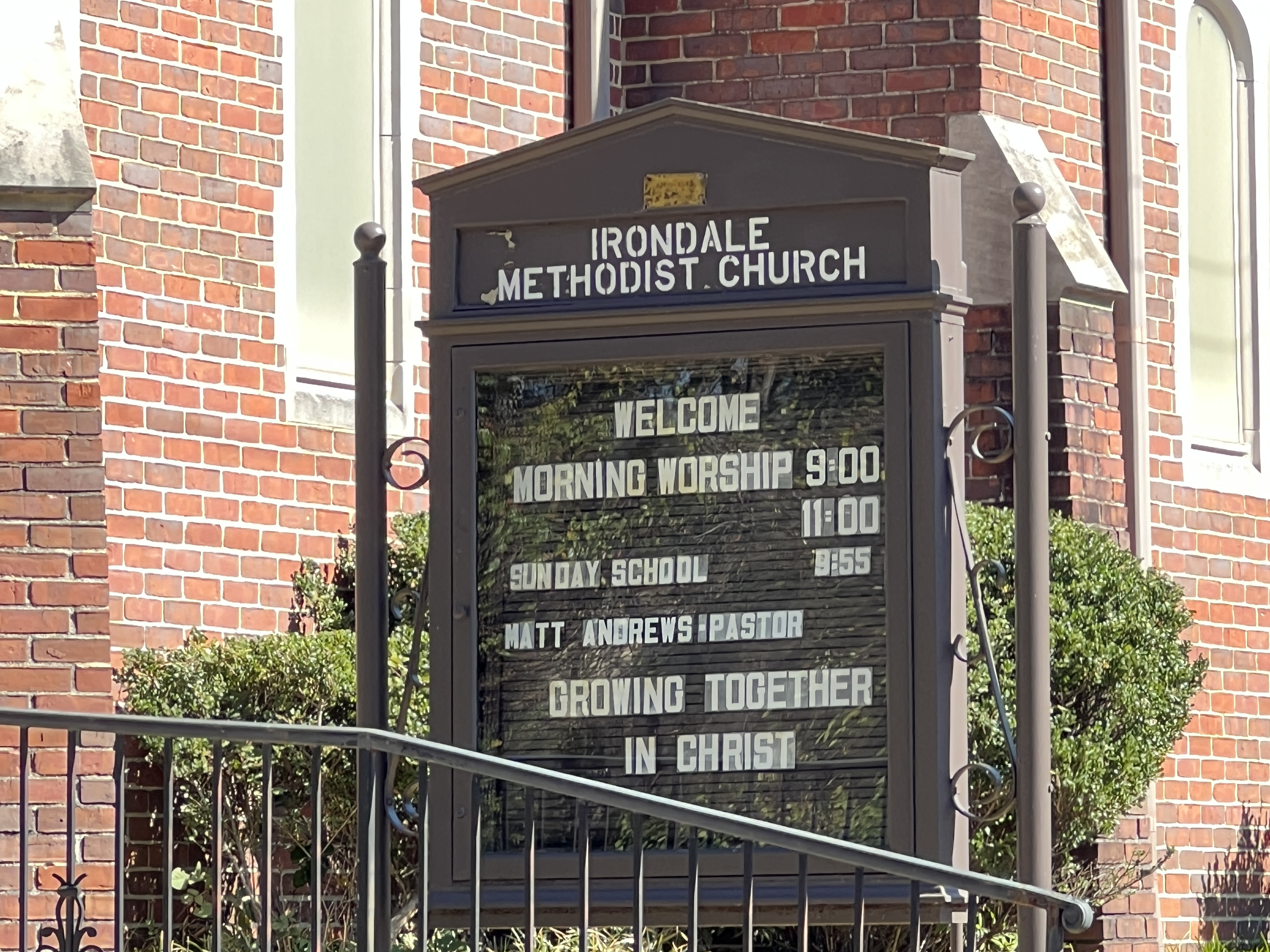 Irondale United Methodist Church is located in the Birmingham suburb of Irondale, Alabama. The city is most famous as the inspiration for the novel Fried Green Tomatoes at the Whistle Stop Cafe (1987) and the movie Fried Green Tomatoes (1991). (I first saw the movie on a Wesley Foundation spring break trip in eastern Kentucky.) The church was founded in 1887, a century before the novel was published, as part of the Methodist Episcopal Church, South. It moved from the center of town to its present location in 1962.