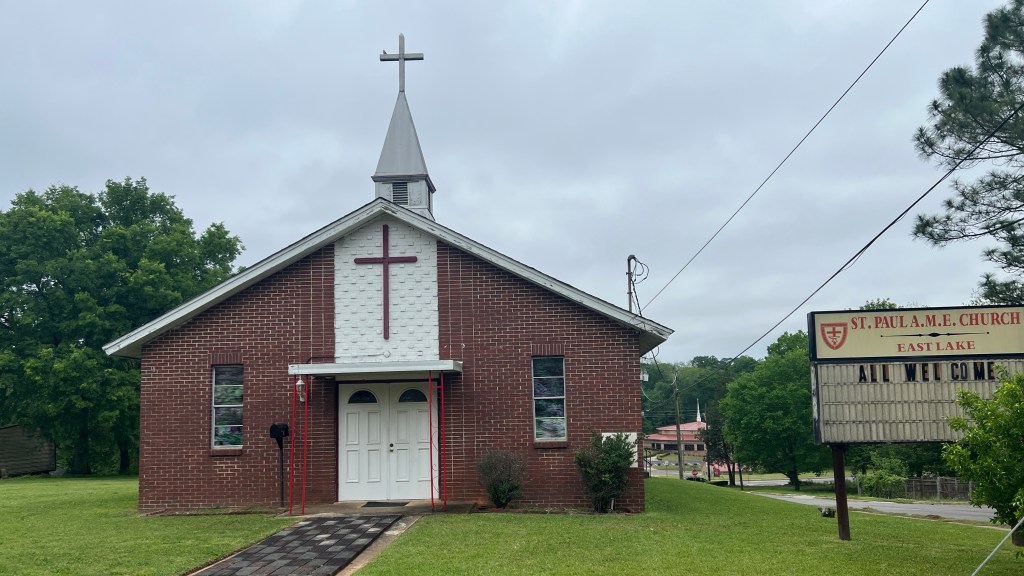 The Brown Springs neighborhood is located on the southern slope of Shades Mountain near Red Gap and the entry to the mining roads of Ruffner Mountain. It was established as an African American neighborhood and was still 81% Black in the 2020 census (with a population of only 393). It boasts a number of churches besides this one including St. James Missionary Baptist Church East Lake and the larger New Rising Star Baptist Church. (“The Star” as it calls itself is visible in the above photograph down the hill from St. James across Oporto-Madrid Boulevard from St. Paul A.M.E.)
