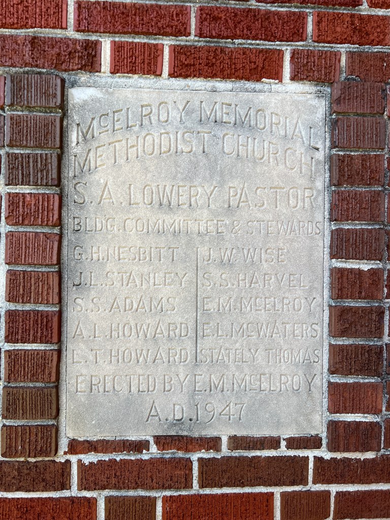 The cornerstone lists the building committee and the stewards (that is, the official board of the church) and E. M. McElroy as the one who “erected” it. McElroy owned a local construction company, I believe. Originally the building had two name stones. One over the entrance of the church as well as the cornerstone pictured below. The stone over the door has been replaced or covered over. The building is now owned by Rhema Word Ministries which appears to have a good attendance at its Sunday services. It is located at 900 39th Street North.