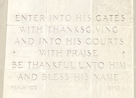 While there is no scripture on the cornerstones, Psalm 100:4, as translated in the King James Version, is inscribed over the door, “Enter into his gates with thanksgiving, and into his courts with praise: be thankful unto him, and bless his name.” Interestingly a more traditional font was used here.