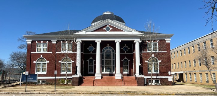 Birmingham architect James E. Green designed this church and a few others like it in other parts of Alabama. It ingeniously combines a plan popular from the late nineteenth century with a style popular in the early twentieth and creates a monumental presence in a mid-block site.