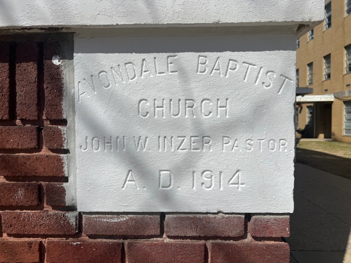 To date the building has served three congregations, one of which has two different names. All of three of the congregations are in the Baptist tradition. The first was initially known as Avondale Baptist Church, this is the name enshrined on the cornerstone, but for most of its history, it was know as South Avondale Baptist Church. When South Avondale closed in 2000, the building became a second campus of New Hope Baptist Church and then later, in 2014, the home of Redeemer Community Church. Though Redeemer is not affiliated with a Baptist association it is baptistic in its practice and at its inception was associated with the credo-baptist Harbor Network. For more on South Avondale’s history and pictures of the interior see Patrick Thompson’s article on Magic City Religion.