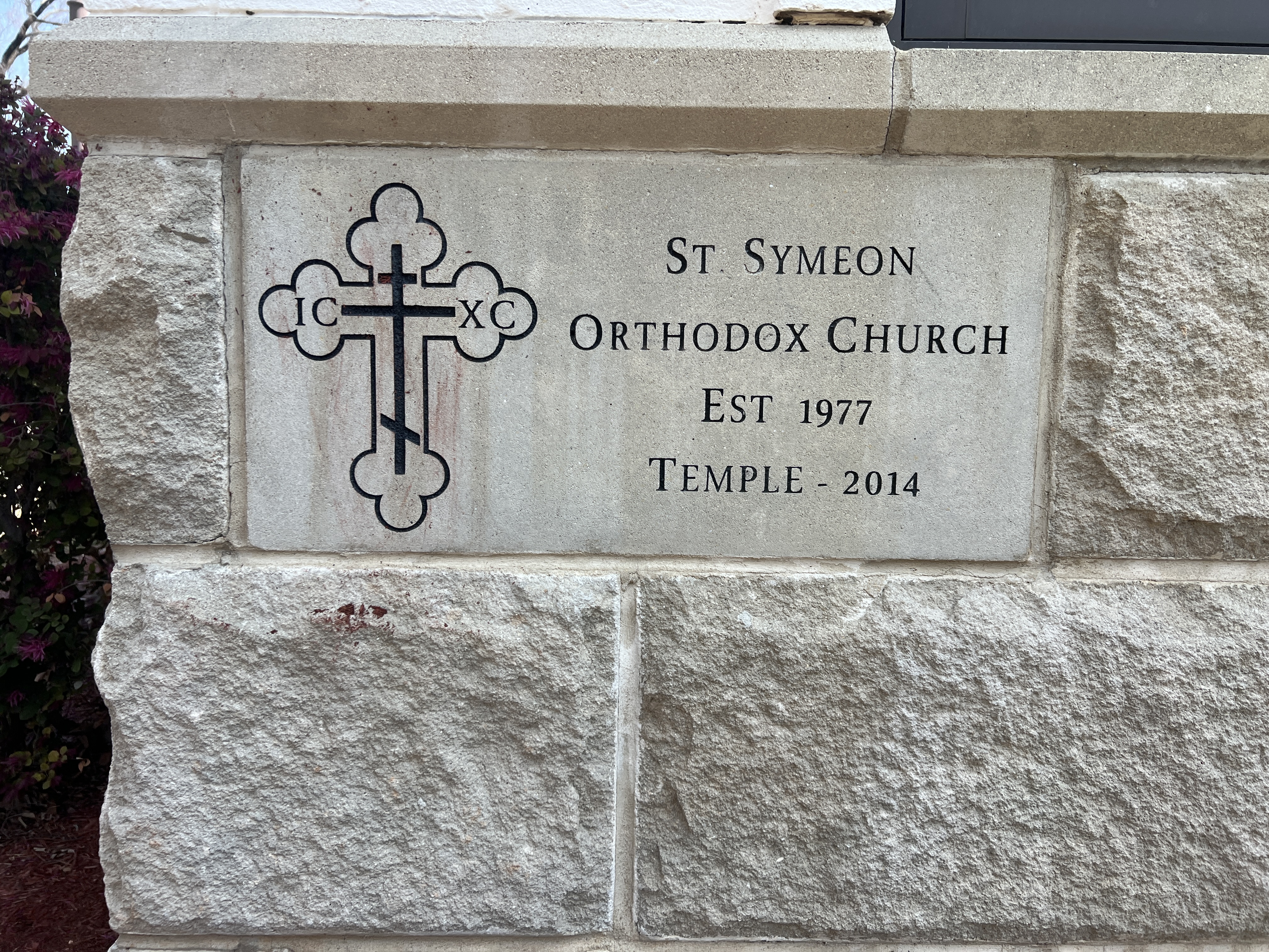 St. Symeon Orthodox Church is a congregation of the Orthodox Church in America founded in 1977. For many years it worshiped in a former Baptist church building on this site before building its own new temple in 2014 and converting the former church to a parish hall. Its cornerstone is probably the most recent one I have yet documented in this series.