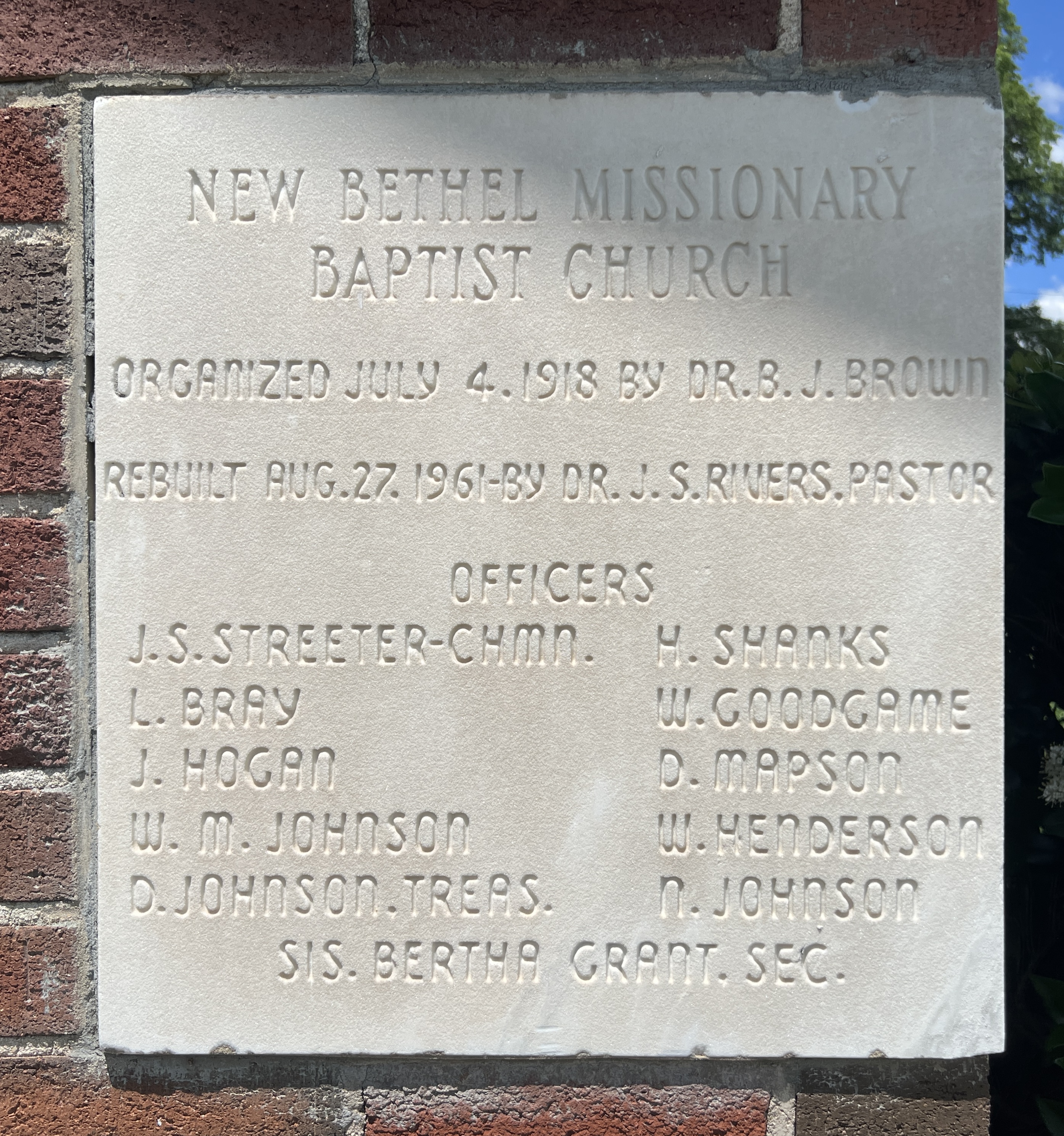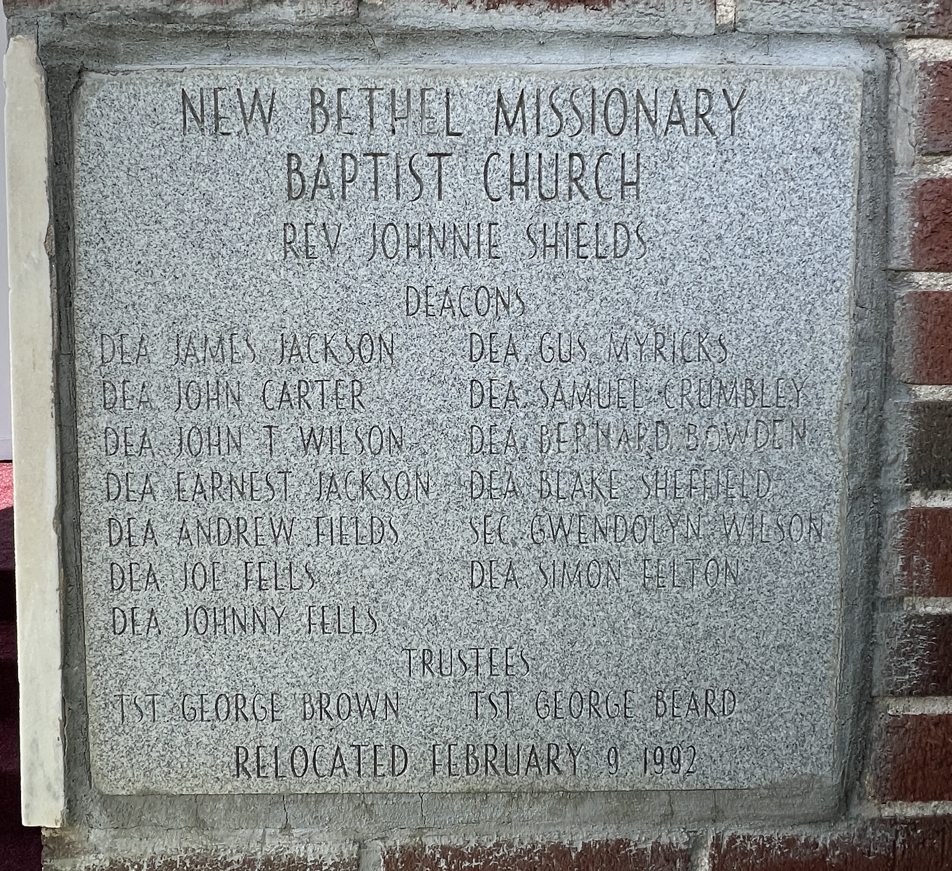 There are two stones. One from its previous building which was located in East Birmingham at 1305 Sipsey Street, a location now incorporated into W. C. Patton Park. Thus, it was near several other churches in this series, Laymen’s Chapel C.M.E. Church, St. Luke A.M.E. Zion Church, and the former site of Forty-Sixth Street Baptist Church, which like New Bethel moved in the early 1990s. Whereas Forty-Sixth Street moved into the building erected for East Lake Alliance Church, this building that became New Bethel was erected for East Lake Primitive Baptist Church.