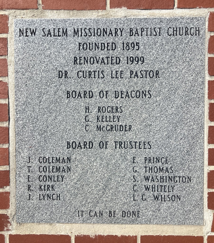 New Salem Missionary Baptist Church is located in the Mobile Junction neighborhood of Bessemer, Alabama, at 101 Pine Street Southwest in Bessemer, Alabama. Thus far, it is the southern-most church included in this series. It was founded in 1895 and the most recent stone on its exterior marks the renovation of the church in 1999. Besides names and dates, church cornerstones sometimes contain phrases from scripture, or dedicatory phrases such as “dedicated to the glory of God.” This one celebrates the church’s achievement and motivates others by stateing, “It can be done.”