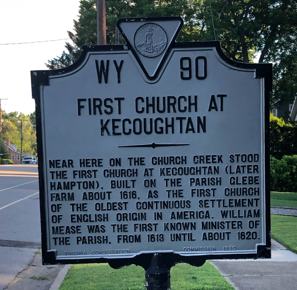 The second creek or marsh the builders of Kecoughtan Road had to ford was Church Creek. Today, you don’t see the creek from the road, but you do see Church Creek Apartments. The marshy creek is behind the apartments. Church Creek is named for the first church erected within Hampton’s limits. It is remembered as “The First Church at Kecoughtan” by a marker about a quater-mile down La Salle Avenue its intersection with Kecoughtan. The church was built about 1616 and used for perhaps eight years until a new church for the parish was built on the east side of Hampton River near the present Hampton University. That site, and the third site, on Pembroke Avenue are both preserved. The first church site is not. Since 1724 the church has been located at its present site in downtown Hampton and since 1830 known as St. John’s Episcopal Church.