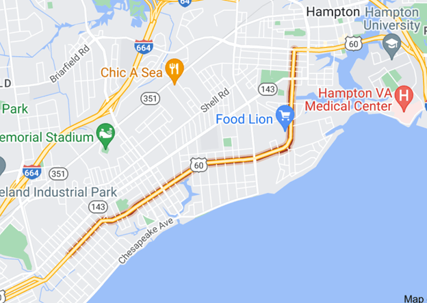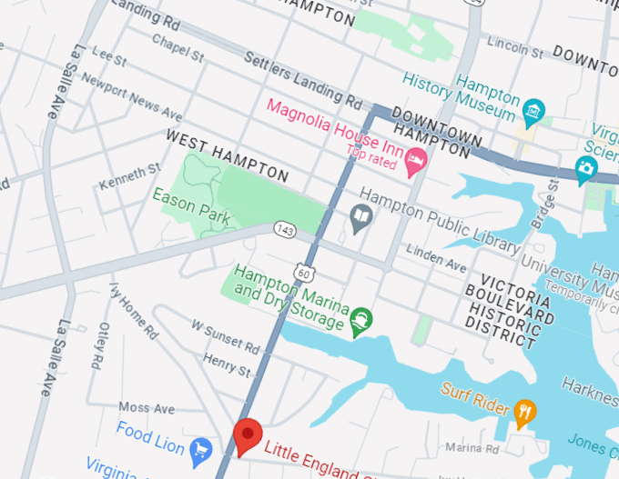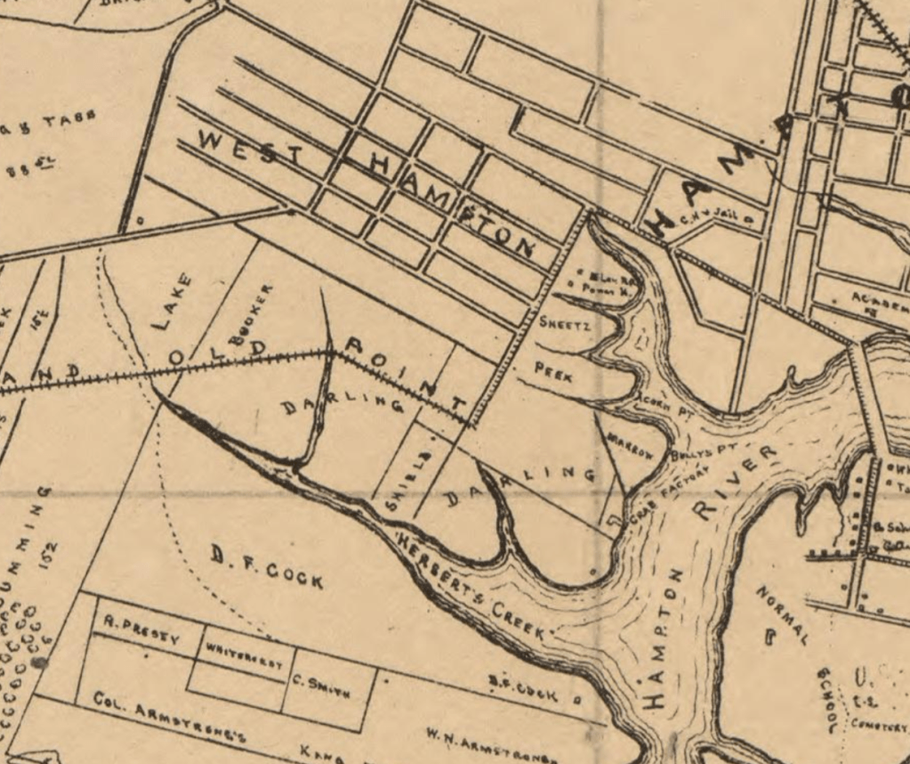 Until Kecoughtan was built, if you were traveling to our next church by land you would need to head west to cross the upper reach of Herbert’s Creek and then back to the southeast on the dotted path on the left-hand map below, which became Ivy Home Road. When Kecoughtan was built, Herbert’s Creek (now known as Sunset Creek) was bridged. In fact the bridge is really just a culvert, you hardly notice the creek on the west side of Kecoughtan. I looks like the now dredged creek simply ends on the east side of the highway. Since Kecoughtan Road runs so close to Hampton River and the harbor, this is just one of many creeks that had to be crossed or filled in. These two maps show the difference. Kecoughtan Road/Jackson Street is the street between the “M” and “P” in Hampton. on the older map.