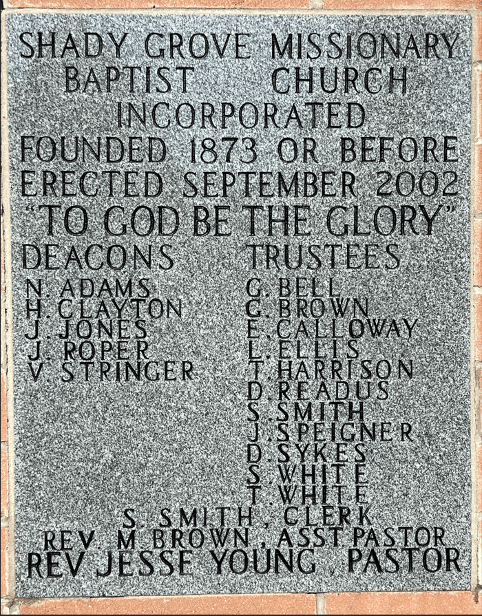 Shady Grove’s current building was erected in 2002 and while no earlier cornerstones are displayed in the building’s wall, the stone proudly declares that the congregation was founded in 1873 “or before.” This is not the only cornerstone that reflects the fact that the exact date of a congregation’s founding is unknown, but it is one of the few. A quick glance at entries referencing this church on Bhamwiki reflect the fact that it has been a major community institution serving as a polling place and the site of important community meetings.